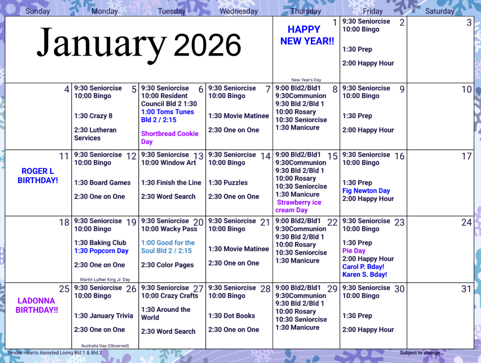 Our full activities calendar is always designed to meet each resident where they are. Our team members take great pride in making sure everyone is fully engaged in the things they love.